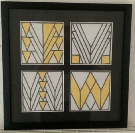 The quilt group members were set a challenge, all using the same fabric, to make a small piece depicting the items and designs in the house. These were displayed in small box frames and sited in a 3 x 3 formation on a wall. This showed off the designs of the nine quilters very well, all of them very different.