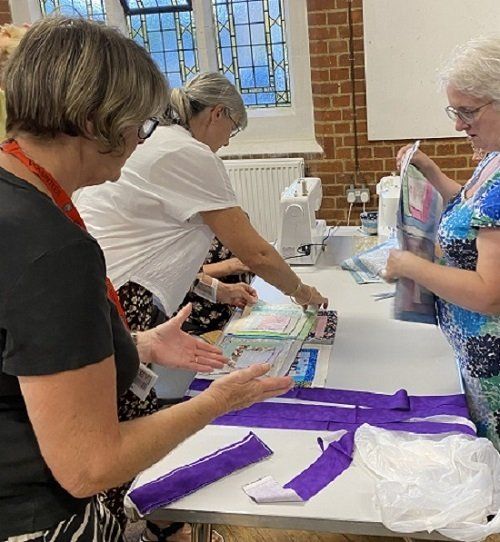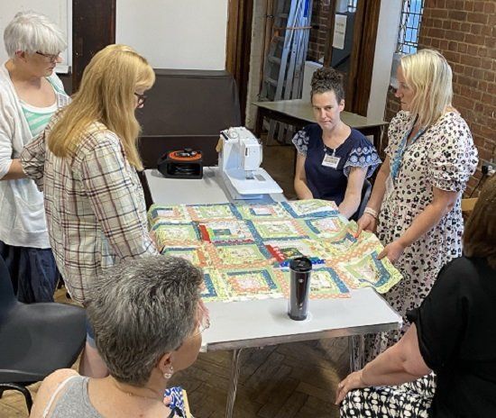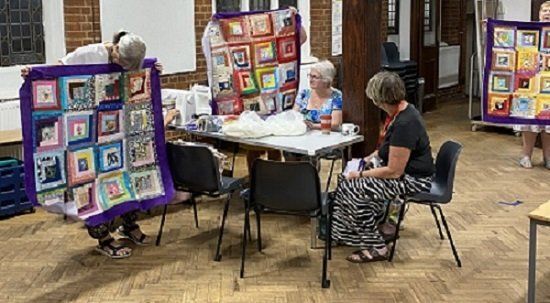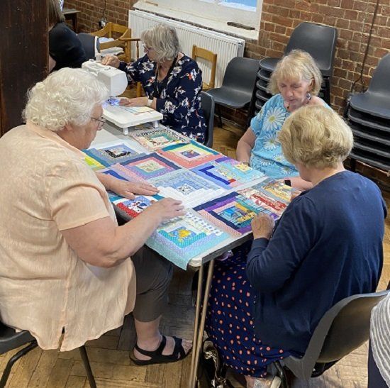 Claire opened the meeting in her inimitable style with a series of notices about quilting events both locally and further afield. Claire reminded anyone planning to go to the Festival of Quilts in Birmingham about train strikes that will affect travel arrangements, but was confident that it would be a good show. Eileen has subsequently confirmed details of all the events in an email. Each table then got on with making up at least one quilt, having been given packs containing blocks, border, backing and binding - everything we needed!