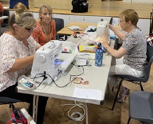 Each table had a “machinist” and other members worked with them planning, pinning, and pressing as gradually our quilts came together. I was fortunate to be sitting at the same table as Freddie and saw many of the amazing collection of items that had been made for the tombola. A huge range of donations included bags with all sorts of uses, felt mice, bean bags, Christmas tree decorations, small soft toys, covered notebooks and many other items – too many to list here! The common factor being that they were all beautifully made and will be a pleasure to own. A real credit to the creativity of our members.