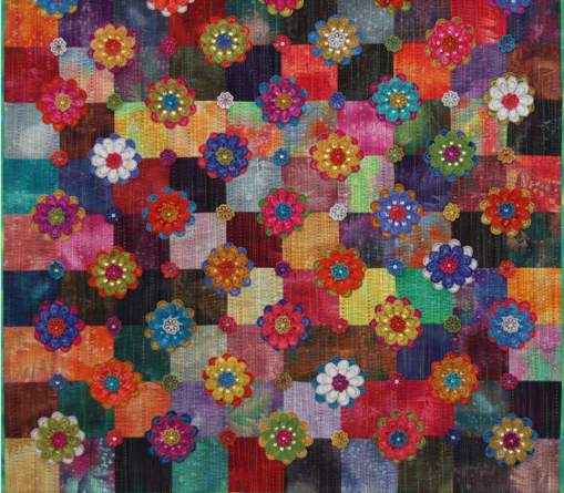 It was a bright morning when members of the Parklands Patchers, and some friends, met at Morrison’s car park at 7.45 am in Northampton to pick up our coach to take us to Quilts UK Malvern 2023. We headed off on the two hours plus journey and arrived at the Three Counties Show Ground about 10.15 am. The car park was already quite full and a large queue of (mainly) grey-haired women were patiently and slowly moving towards the entrance to the exhibition buildings, by-passing the ice cream van that came into its own later in the day when the weather was very sunny and hot.