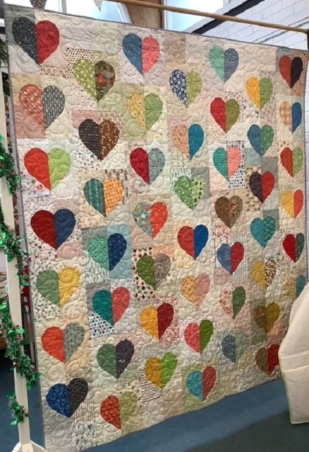 After a long bus ride, I entered the shop to be met by a fantastic display of colourful quilts. The one that caught my eye first was by Kathy L - it consisted of lots of blocks of two-coloured hearts in bright fabric on lighter coloured backgrounds - and it was made to celebrate the maker’s 50th wedding anniversary to her husband Dave. I voted for this as my favourite.