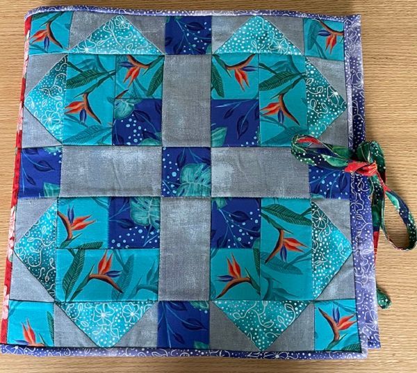The bell rang and we moved onto Eileen’s table where she showed us an amazing quilt made with tiny log cabin squares and explained it had been part of the Group’s January challenge where you were given a piece of fabric and asked to design a log cabin. Eileen then showed us a Cobweb in the Cabin block, in this you start of with the square add fabric around this block, then use triangles for each corner, add four more pieces of fabric and then another triangle, but of course this triangle is larger as the block is now larger. Eileen then showed us other blocks such as a hexagon block, courts house steps block and cabin in the sky.