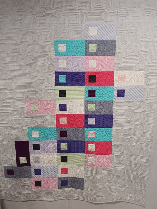 Modern Quilts for Modern Magazines was a selection of quilts by Mandy Munroe, who produced a regular monthly design for Popular Patchwork magazine for 12 years – a prodigious work rate! These struck me as the most conventional on display, which was perhaps what the magazine wanted, but I particularly liked Stack, inspired by seeing stacks of shipping containers at a port: interesting colours and a bit of asymmetry.